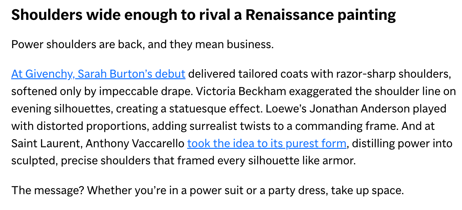 Confirming that I did indeed make the right choice to keep this, it looks like power shoulders are back…