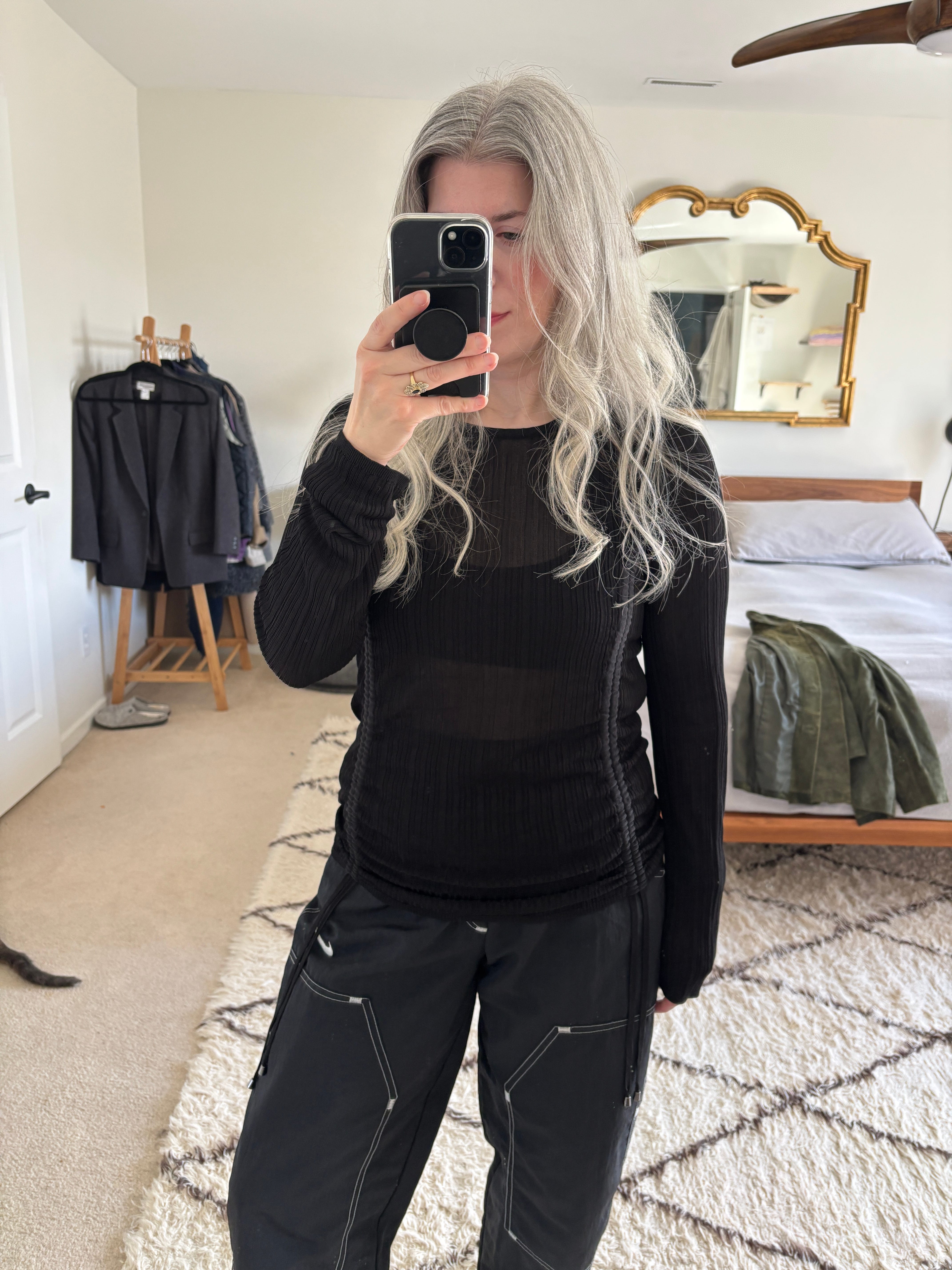 After about 20 minutes, I settled on this sheer-ish top with ties. This top fits more snugly, without being tight, and I think the proportions work really well with the pant/sneaker combo.