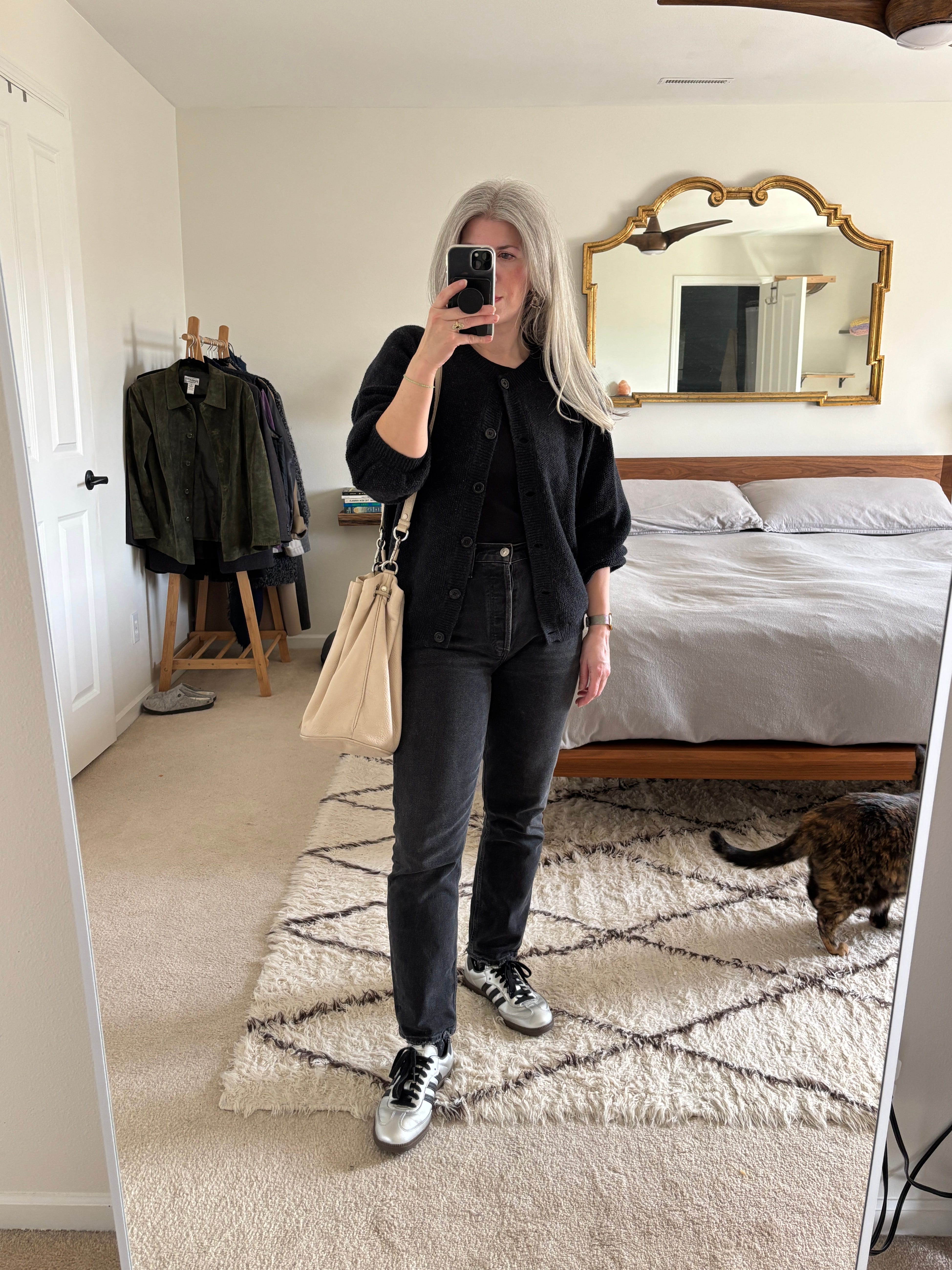 I stuck with a similar base outfit as yesterday with a black tank top and the same black jeans. I swapped the blazer for a charcoal cardigan and the boots for my silver sneakers.