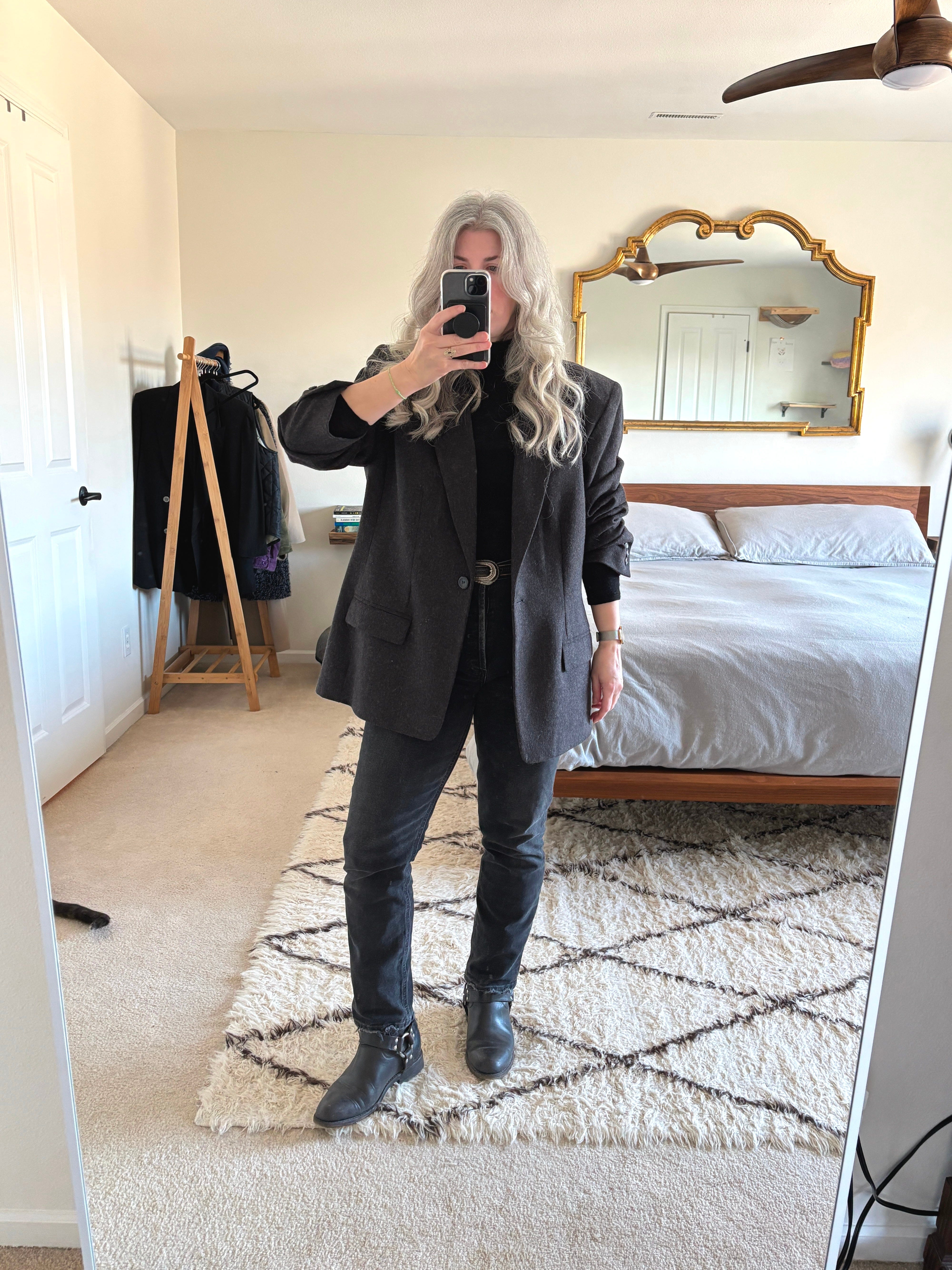 I added the grey wool oversized blazer as all I needed was a light layer and I pushed the sleeves up and held them in place with hair elastics.