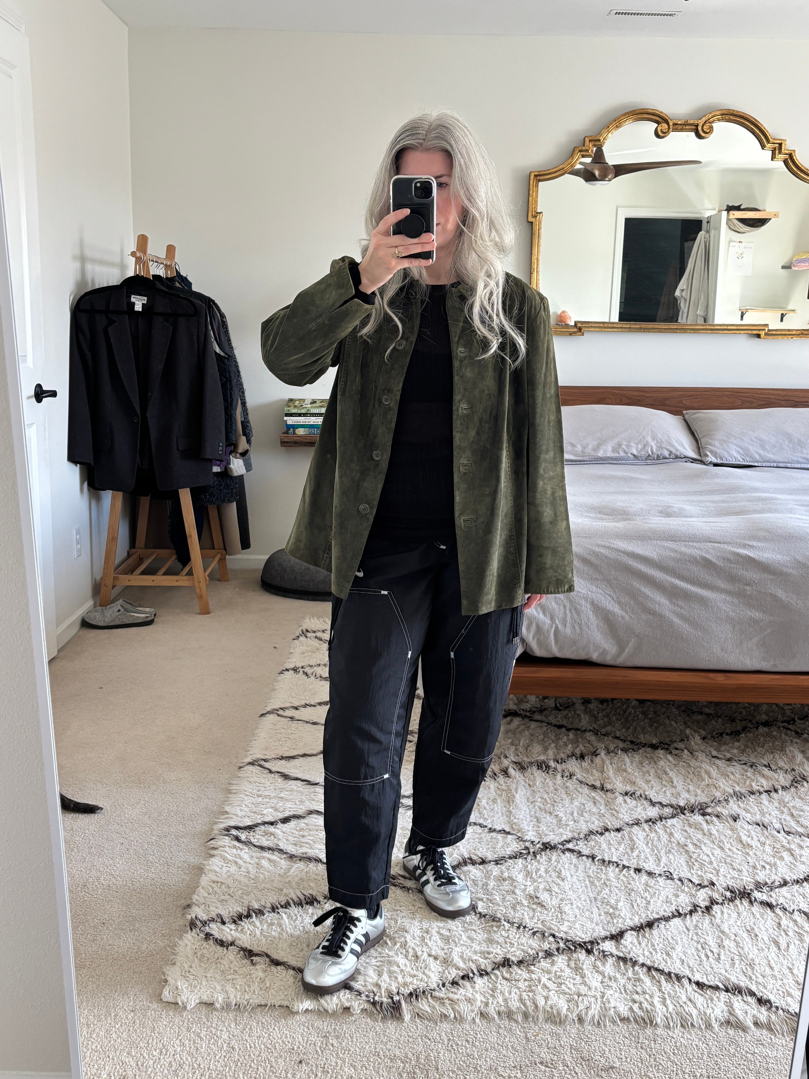 I added my green suede jacket and I really enjoyed the olive/black/silver combo. Not that you can tell, but I wore silver statement earrings too.