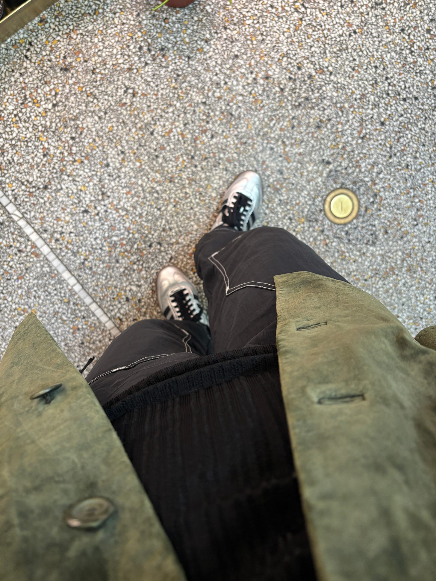 As I stared at my clothes on this day trying to decide what to wear, I realized that it had been a while since I’ve worn these black nylon pants and since it was pretty warm outside and the roads/sidewalks were dry, I pulled out my silver sneakers to wear with them.