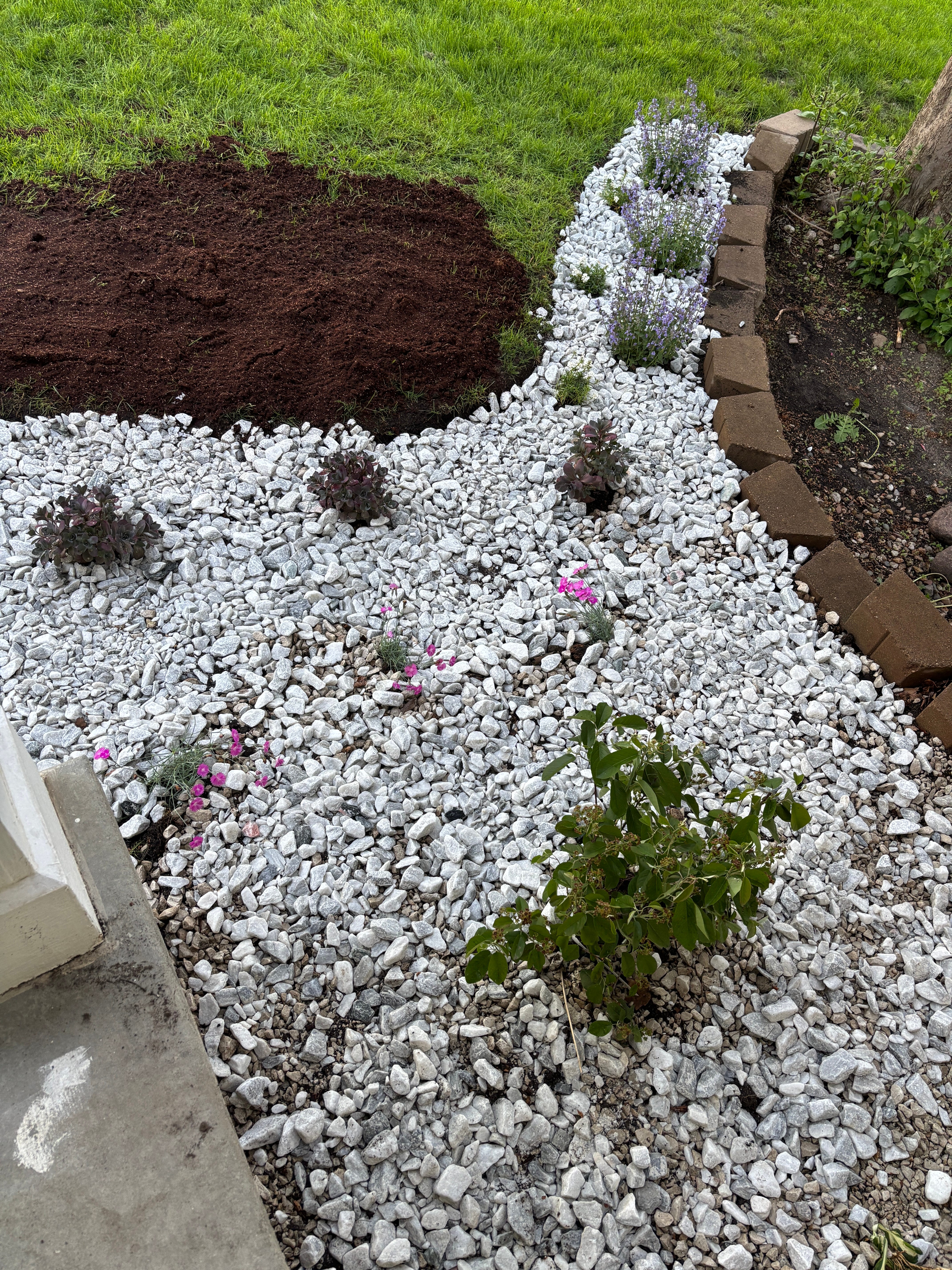 For Mother’s Day, I asked to go to a locally owned plant center to pick up some plants to go near the front porch where we had tried to (unsuccessfully) grow some grass. Luckily, someone at the plant center was able to help us make a plan for the area that we wanted to plant in and we ended up getting 10 plants and some white rock.