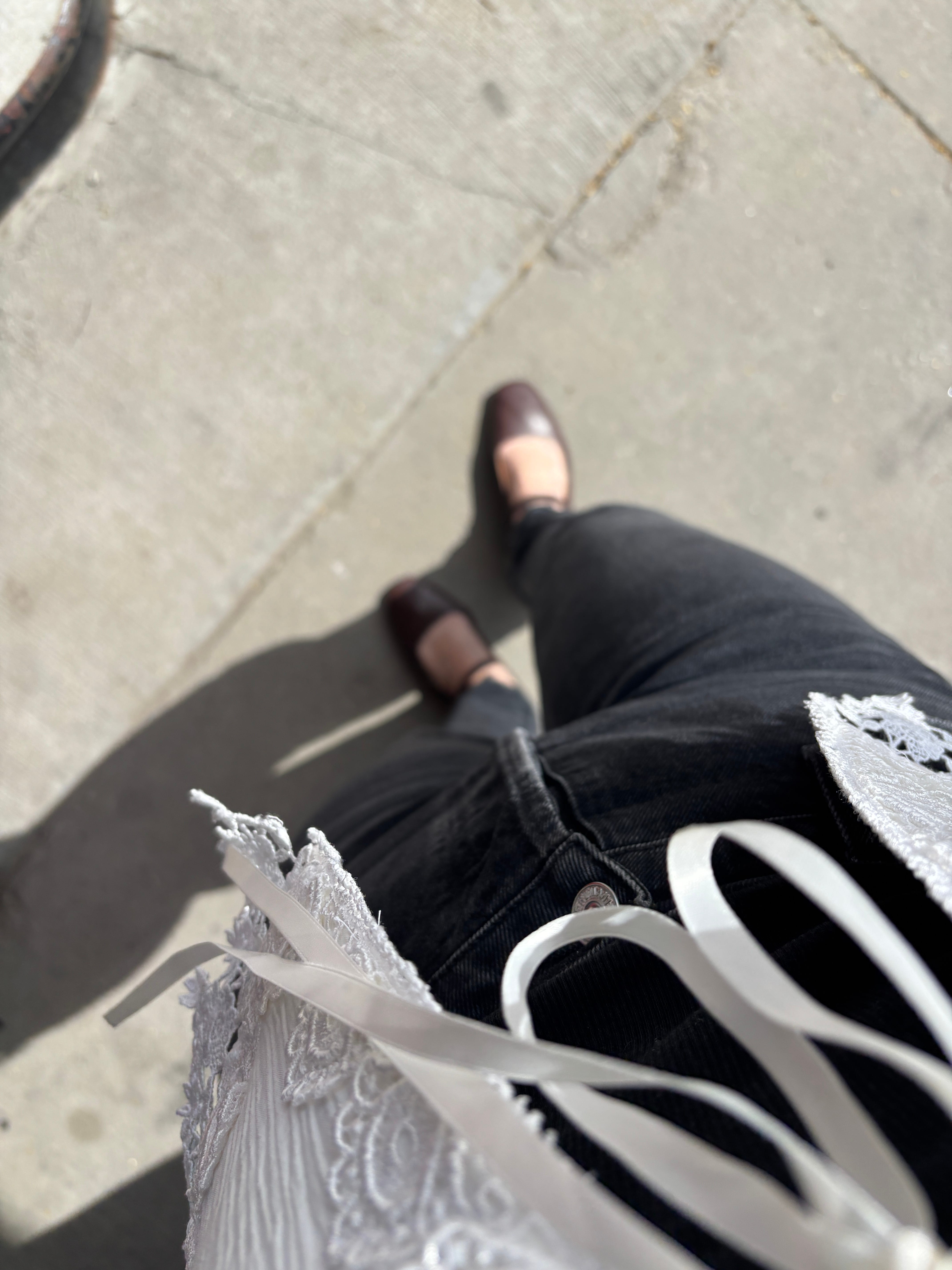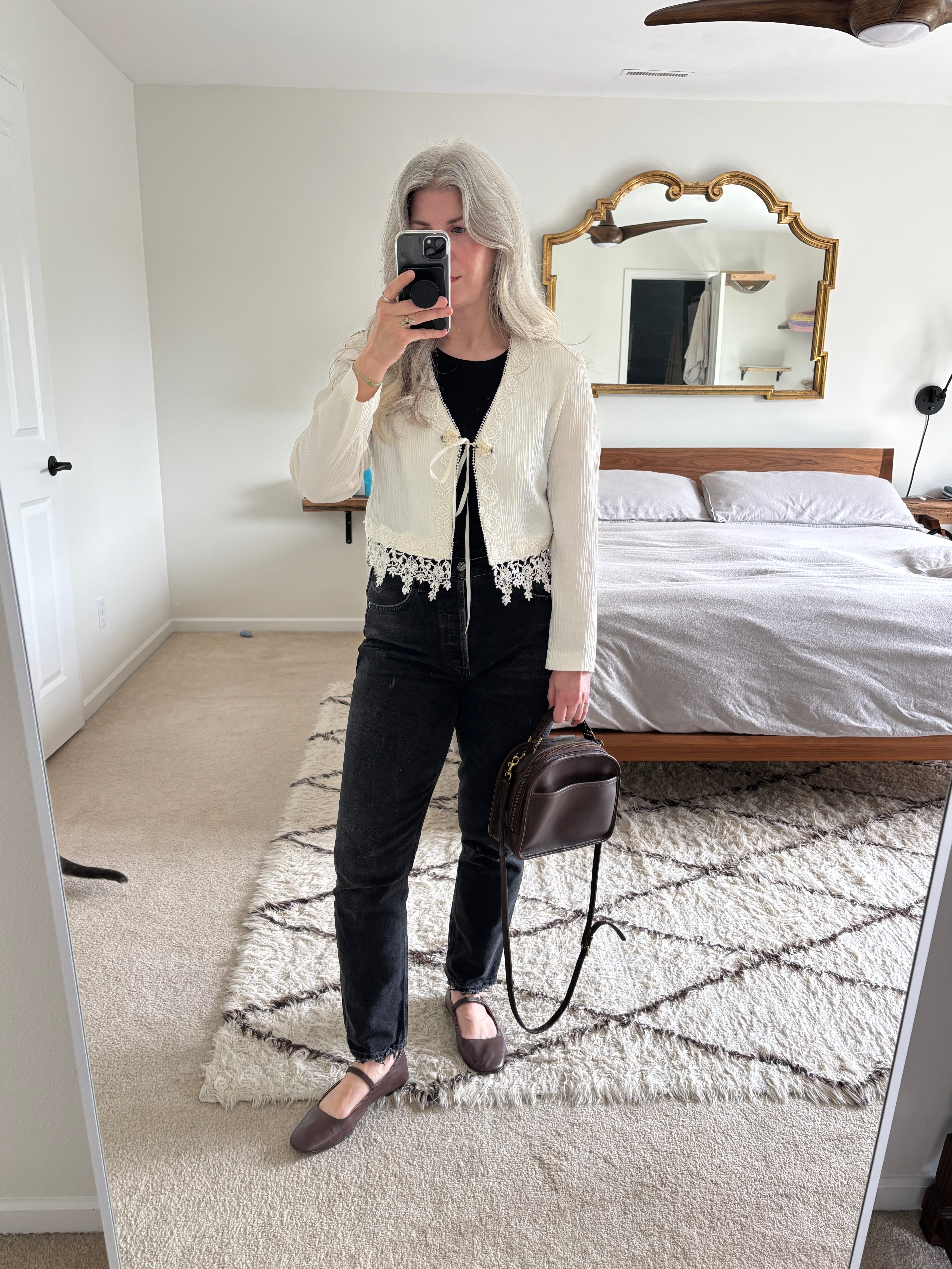 I started with a base outfit of a black tank top tucked into my black straight-legged jeans. I have 2 options for brown shoes - my new ballet shoes or a pair of chunkier fishermen sandals. I opted to go with the ballet flats for more elegant effect. I did momentarily think about wearing my cream sweatshirt again but then I saw my white vintage tie-front top and knew that it would go perfectly with the other pieces. I got this in the time between my no and low buy years and at first, I was a little precious about it so I wasn’t reaching for it, but it brings me so much joy to wear it and I’m really trying to lean into that!