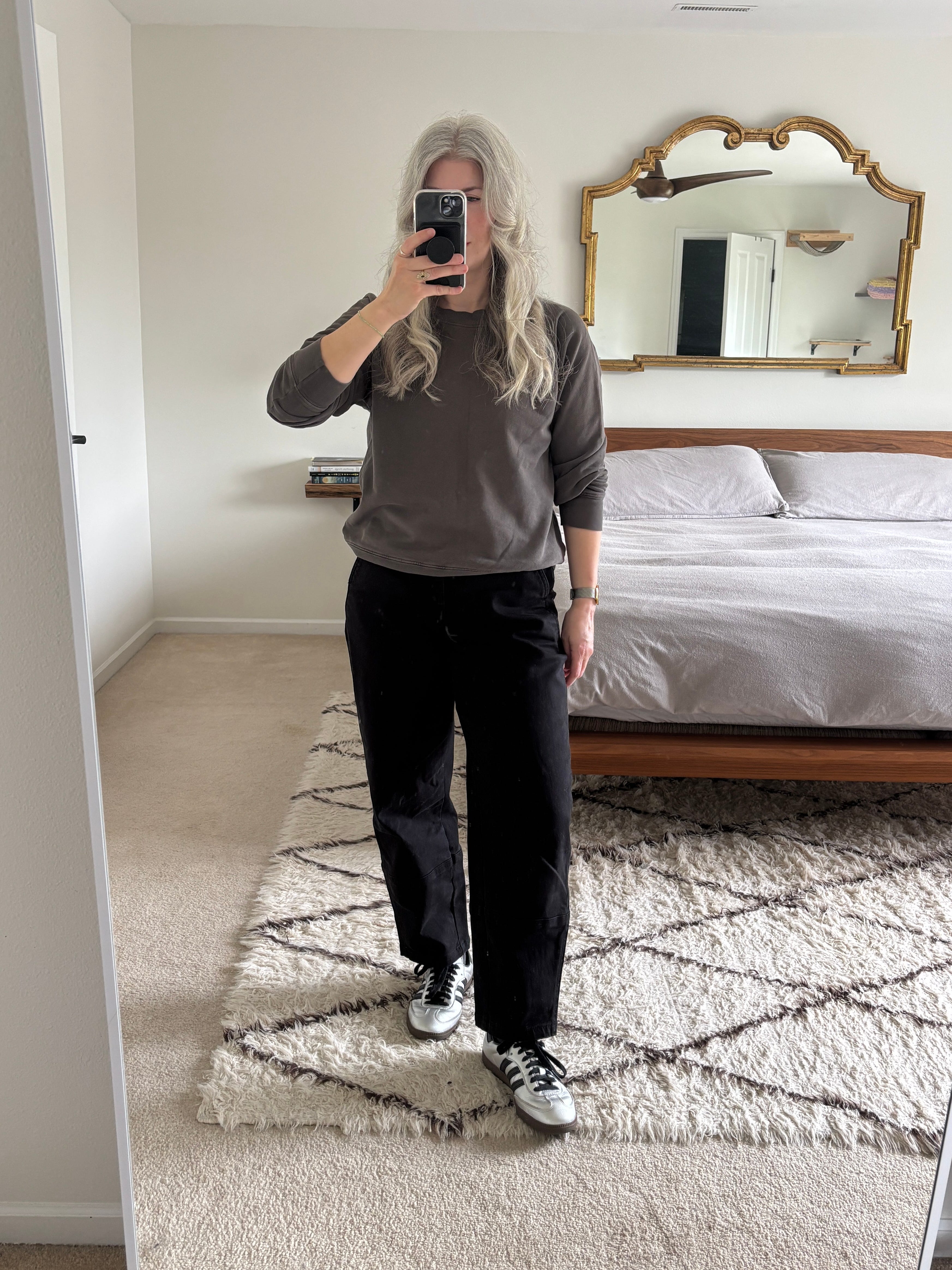 I paired them with a grey crewneck that I’ve had for years. It (plus it’s matching pants) was a Christmas gift from my family one year. I actually wear the pants as pajama pants and they are becoming quite worn and there are holes developing. However, the sweatshirt has been barely worn and was almost decluttered earlier this year, but after trying it on, I realized that I really liked the fit and color. It’s honestly a very nice sweatshirt and I’m glad that I kept it!
