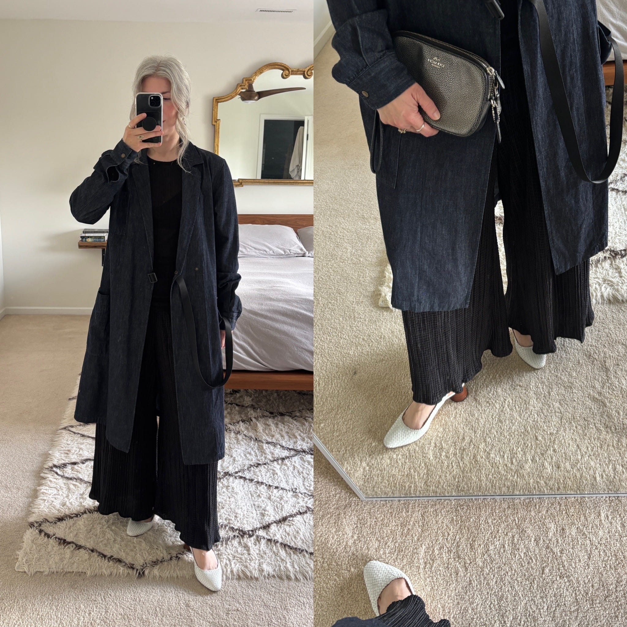 It was low 60s so I wanted to wear something over the top. First, I tried my long denim dress left open. Something about the dress length/the wideness of the leg/the flat sneaker is not working for me.