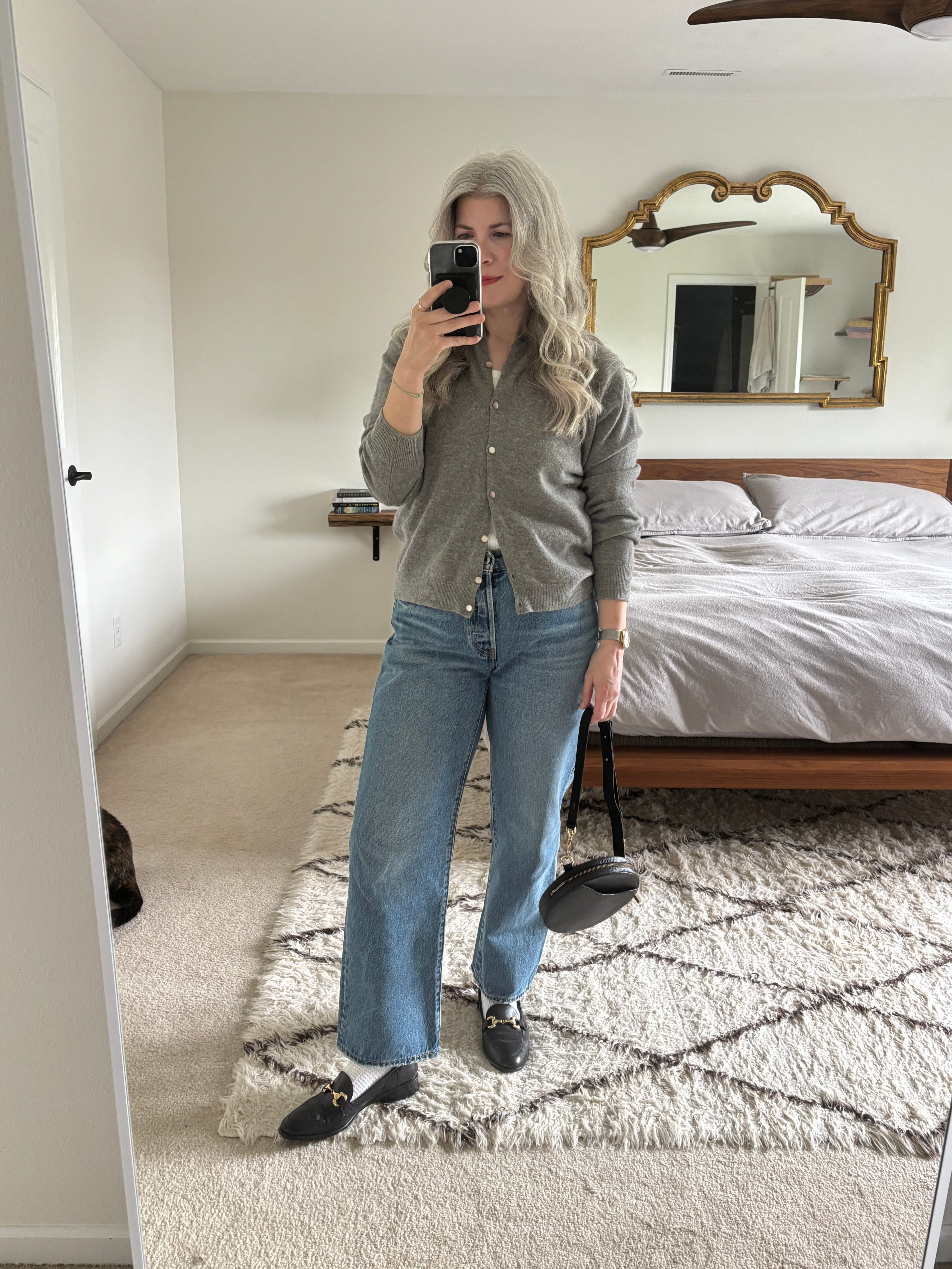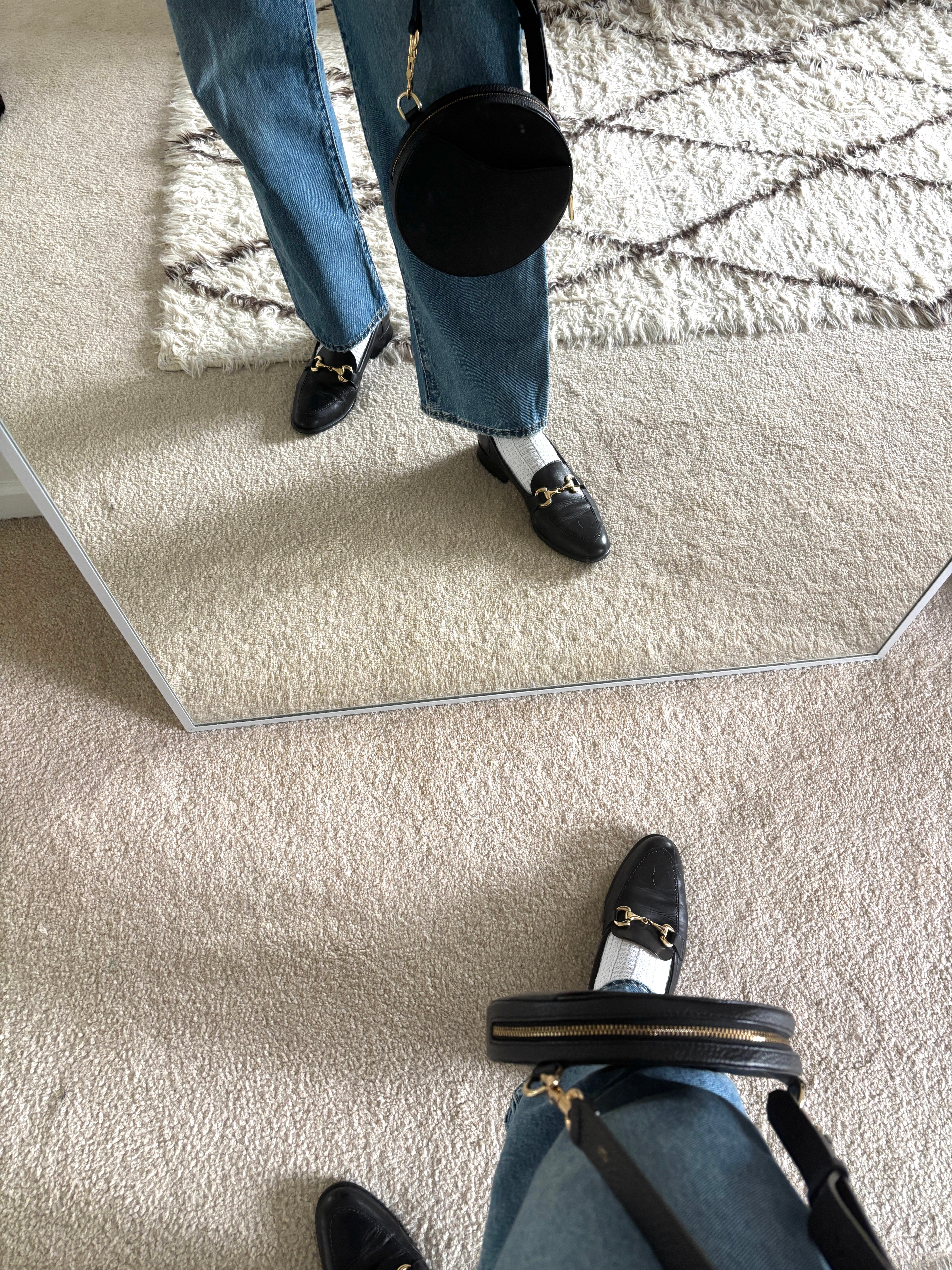 I used her love of cardigans, blue jeans and loafers as the main inspiration. Then I added a white tank top and white socks (because it’s still chilly and these shoes are a little too big so it helps them to not slip off my feet). I kept the jewelry minimal, as usual, and added my black circle bag.