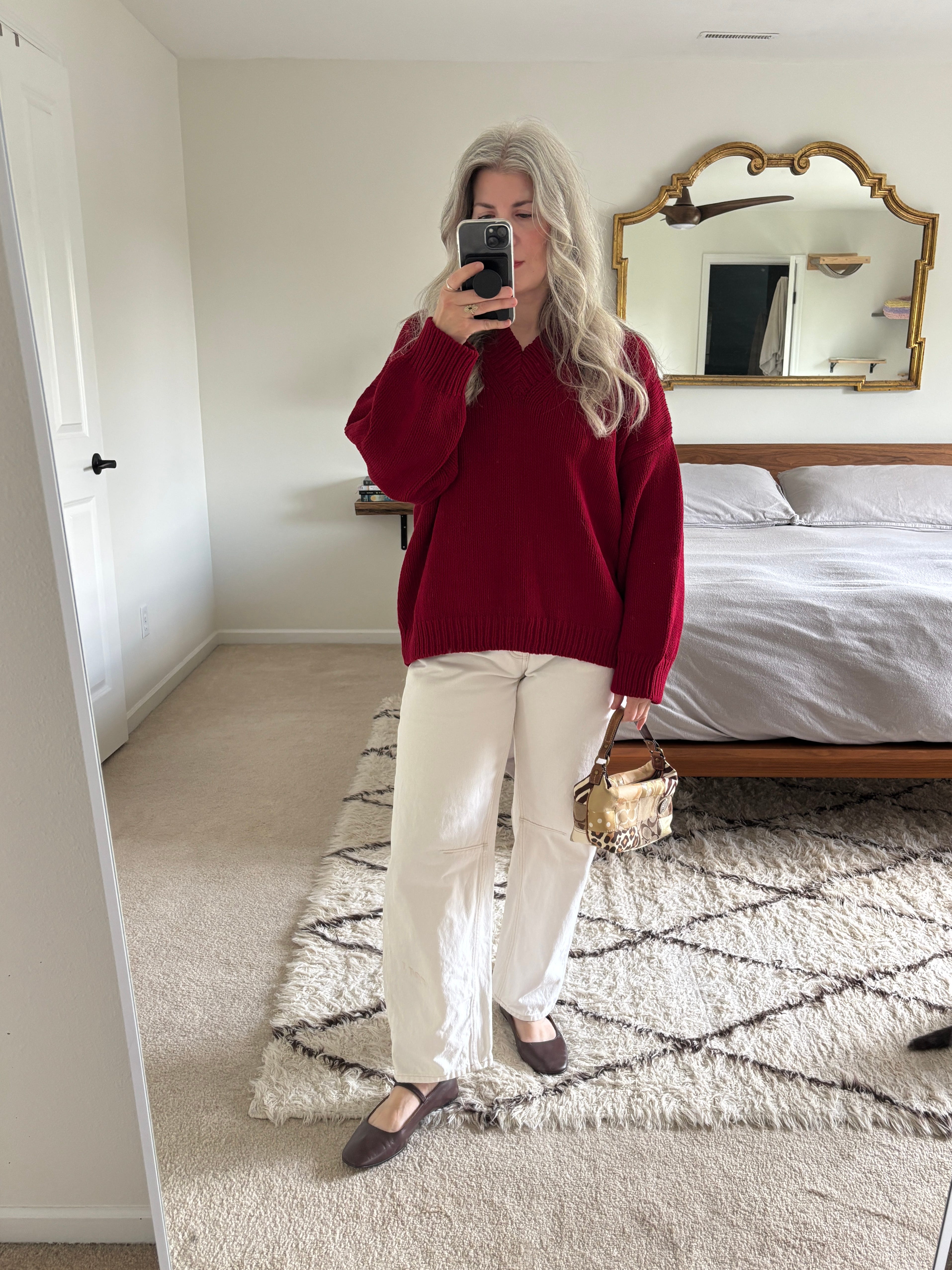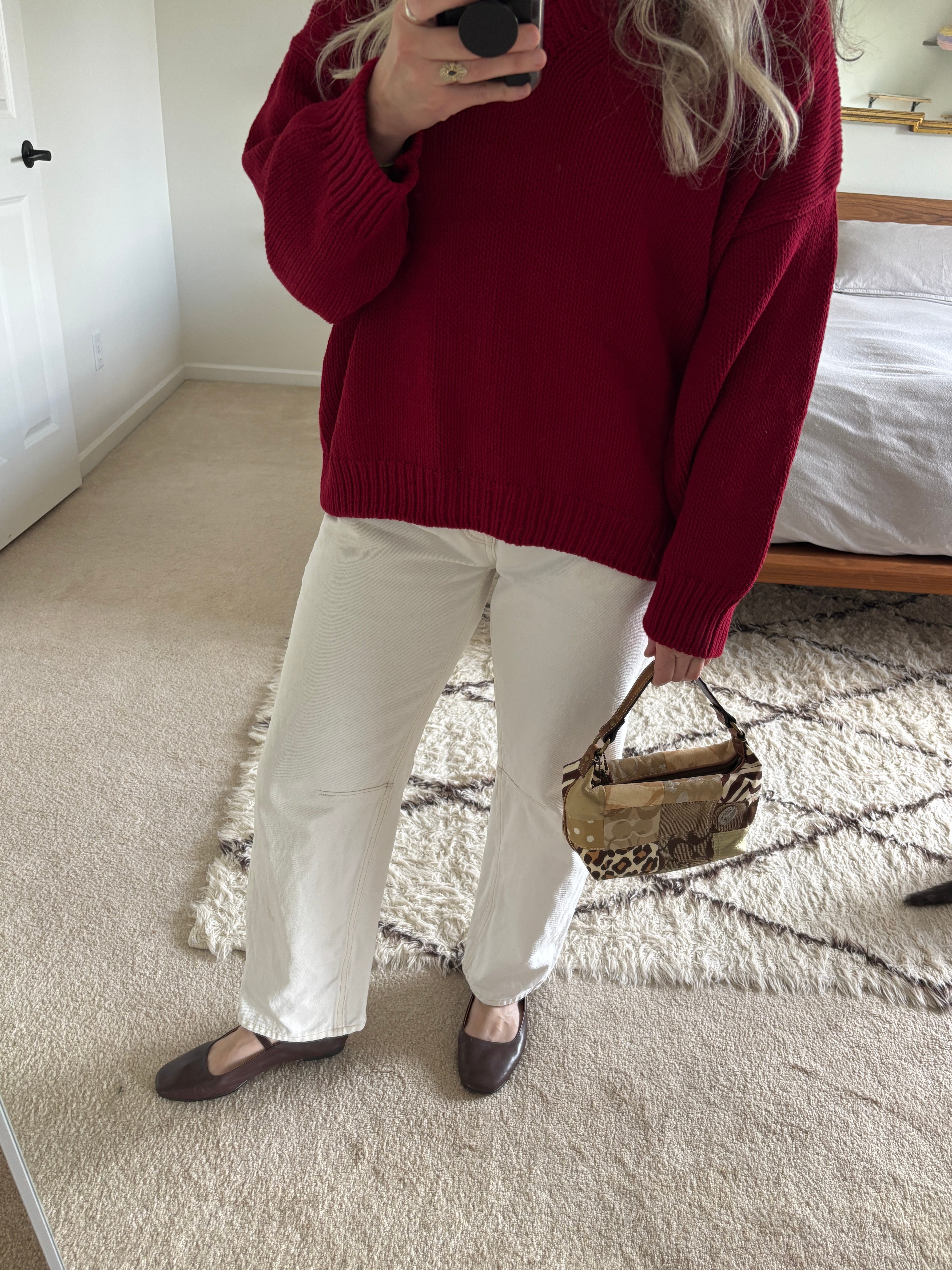 I love red and brown paired together so I decided to wear these brown ballet flats with the red sweater and I love how it looks. I wanted a small bag that had brown tones in it to compliment the shoes so I borrowed this vintage Coach handbag from my daughter - she picked this up in Toronto a few years ago when we were there visiting one of my best friends. She has a little silver Toronto pin on it as well which I think is really sweet!