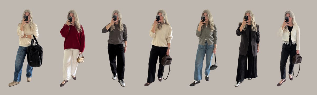 Absolute Favorite: my ABSOLUTE favorite outfit was…ok, I actually have 2 - I just loved the cardigan/jeans/loafer combination from Thursday. I felt really great and I loved the softer color combo with the contrasting black elements (and the socks felt so fun). My other favorite was Saturday’s outfit - I just really love the fit of these black jeans and I love, love, love the detailing of the top. And of course, the color combination!