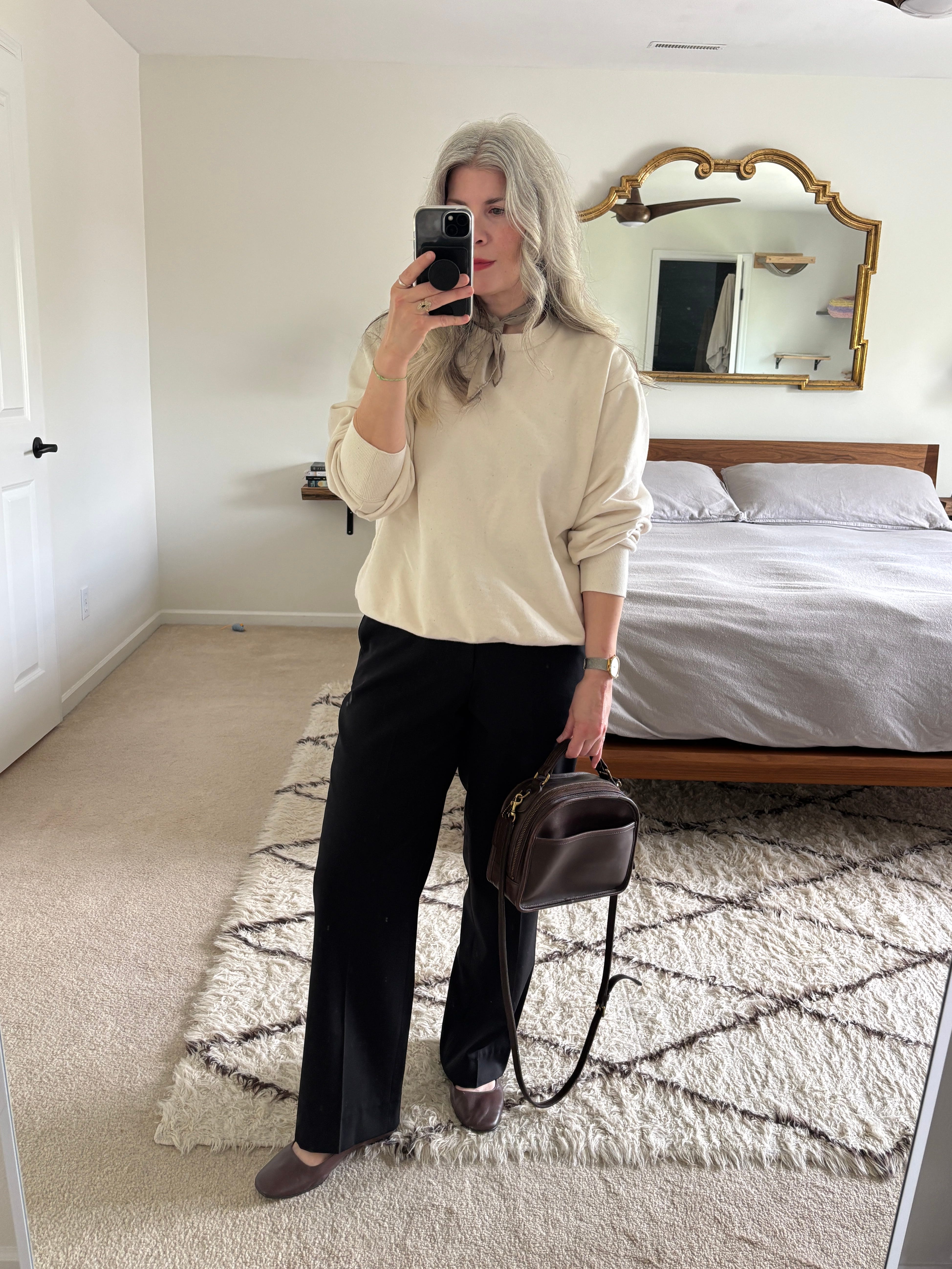 I noticed this morning that I hadn’t worn my black dress pants in a while so I started with them, then I added my brown ballet flats because I wanted to see how the two would work together. I tried a dressier black long-sleeved top but I didn’t think the shapes of the 2 pieces worked together, so I tried my cream sweatshirt and I liked how it’s casualness contrasted with the dressier elements on the bottom.