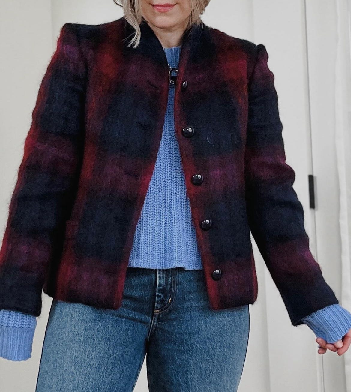 In the winter of 2021, I bought a pink, blue, black and purple plaid mohair blazer. I found it at a local consignment shop in the vintage section. It’s in mint condition and fits me perfectly. I think it’s so beautiful! It would be such a gorgeous piece to wear to an office or to a business dinner.