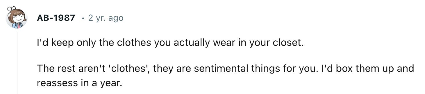 In looking for reasons why it’s so hard to declutter clothing, I came across this reddit thread and one of the comments really stood out to me: